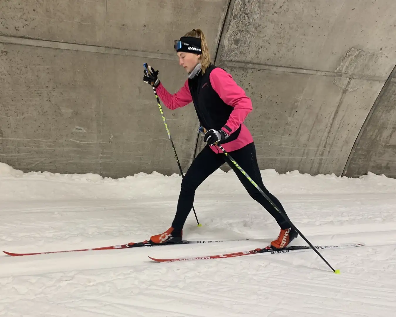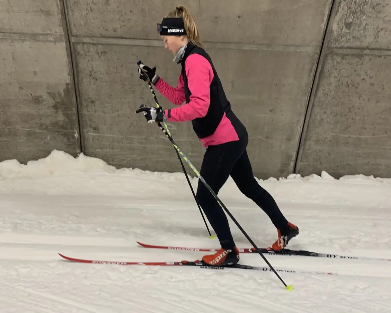 Många som åker längdskidor för första gången får kämpa med att få fäste i uppförsbackarna. Detta är vad som brukar kallas bakhalt och kan se ut som på bilden.