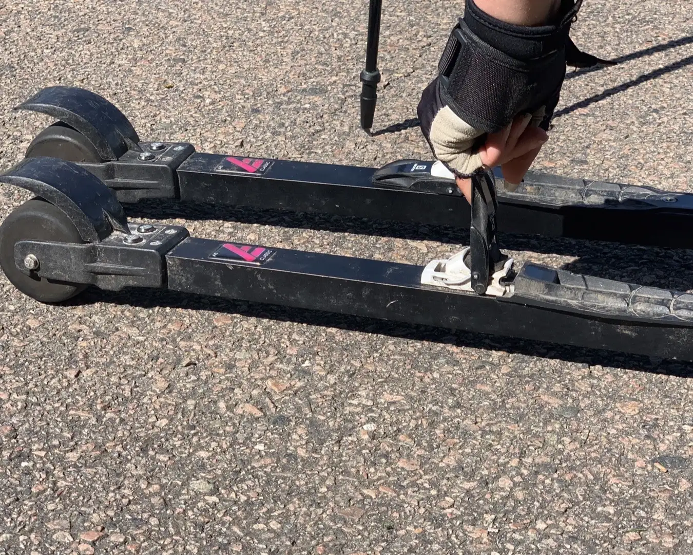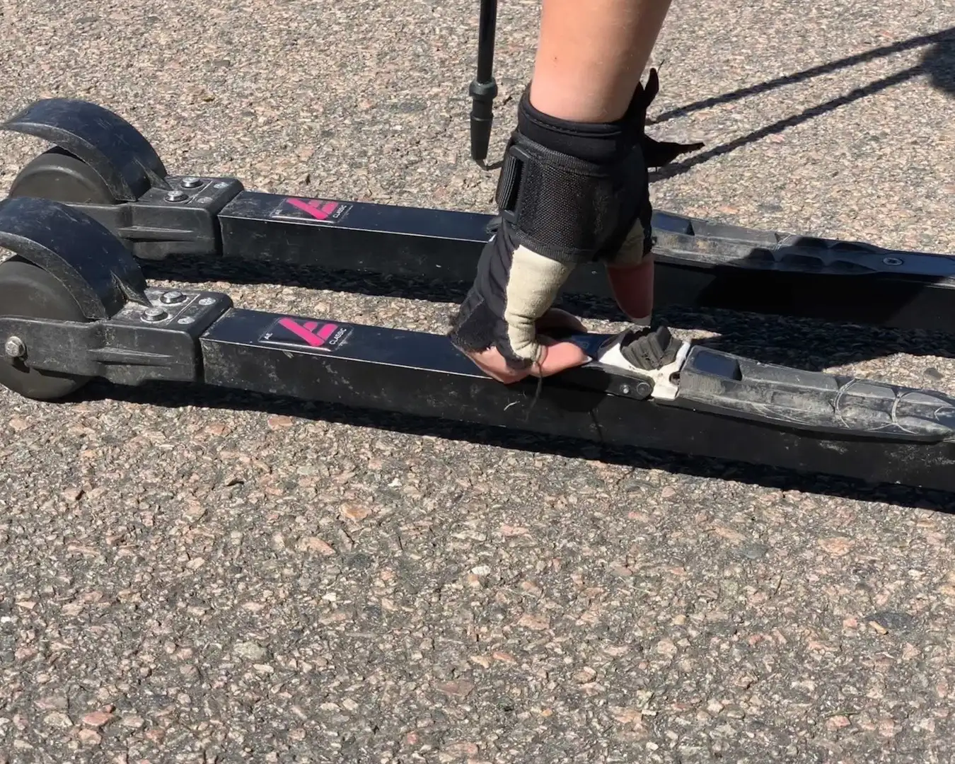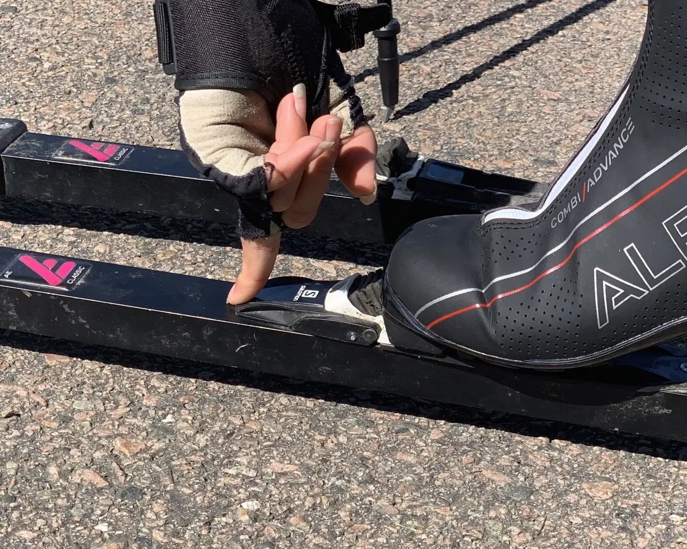 Därefter trycker man ner bindingen så att den låses. Pressa ner tårna lite mot rullskidan för att det ska gå lättare att låsa.