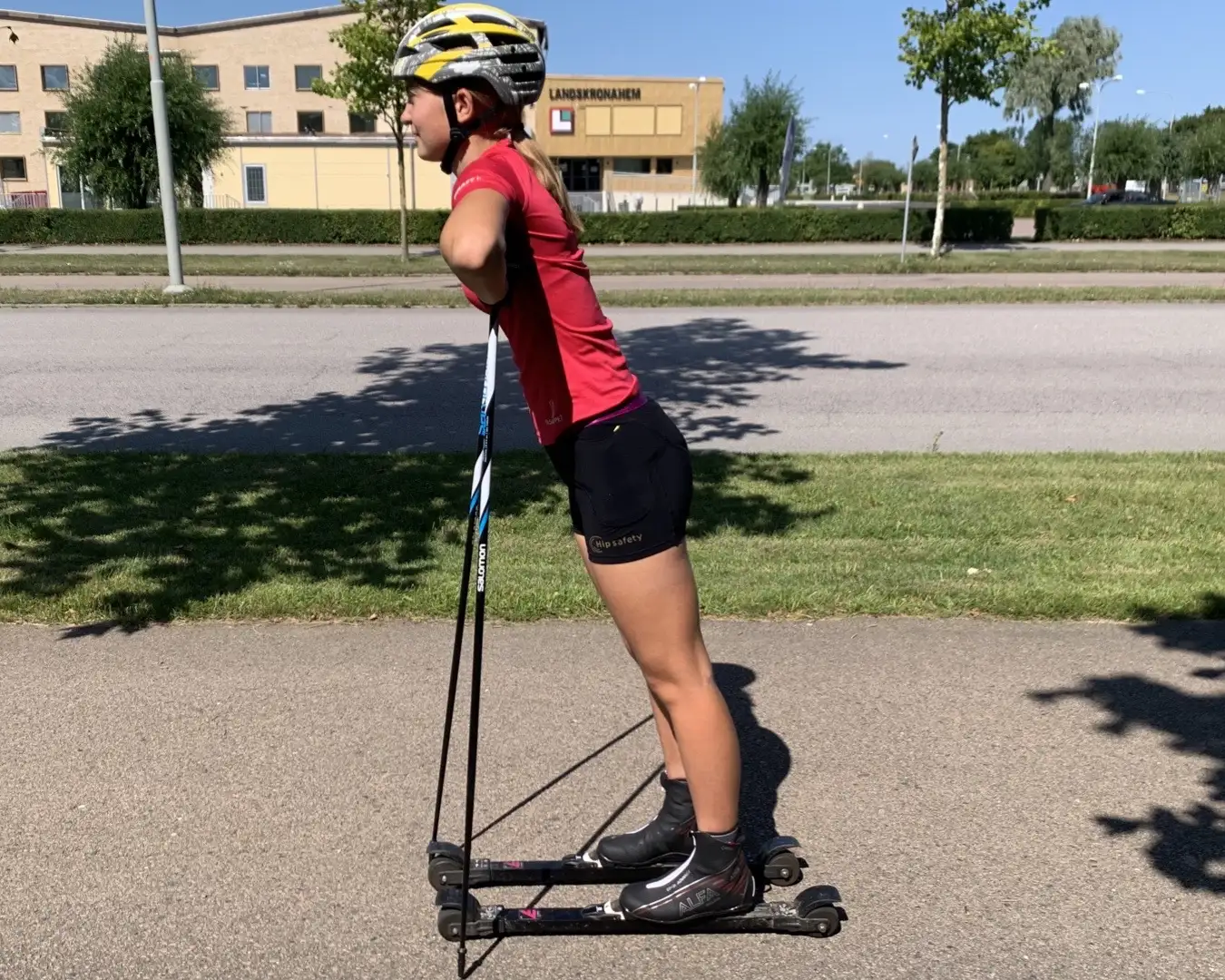 När du står på rullskidorna är det viktigt att komma ihåg att ha mjuka knän och vikten i en lätt framåtdrivande position. Om du står för rakt upp är det lätt att tyngdpunkten flyttas bakom hälen och skidan får möjlighet att rulla framåt utan kontroll och du trillar baklänges.