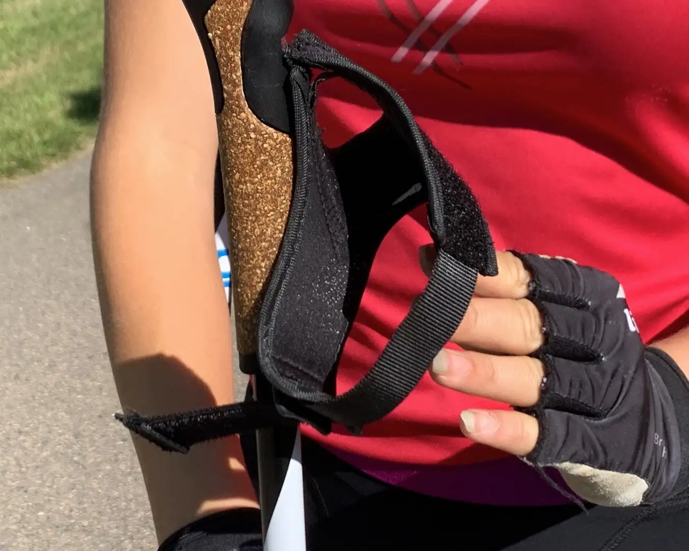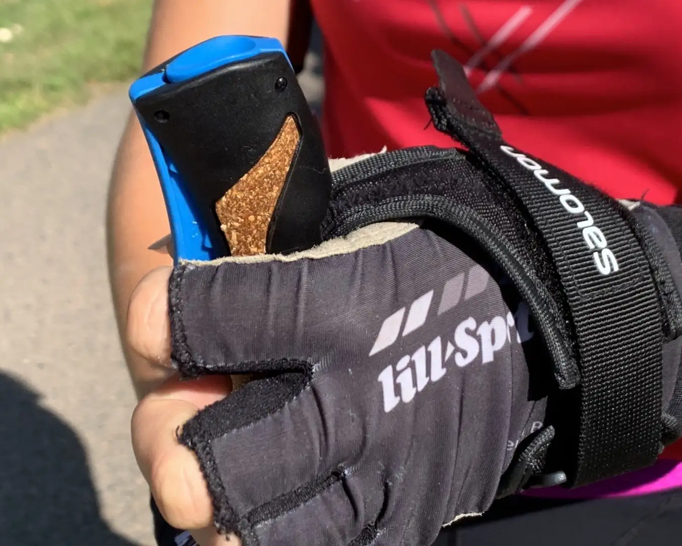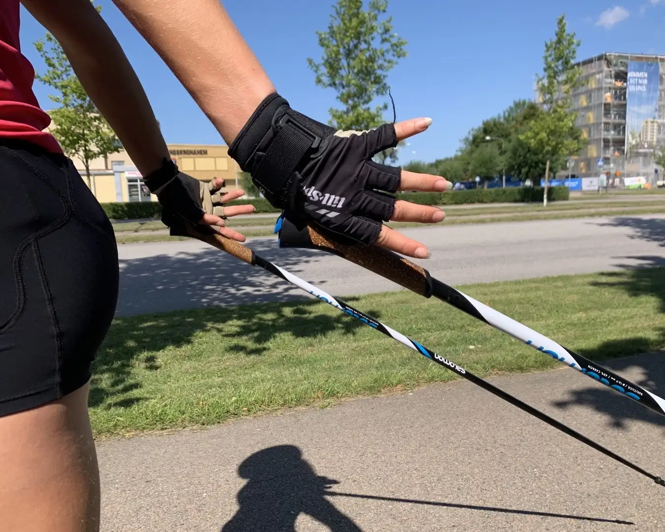 Spänn fast handen i remmen så att du inte behöver hålla i staven, handen ska endast styra staven, i övrigt ska du kunna lita helt på handremmen.