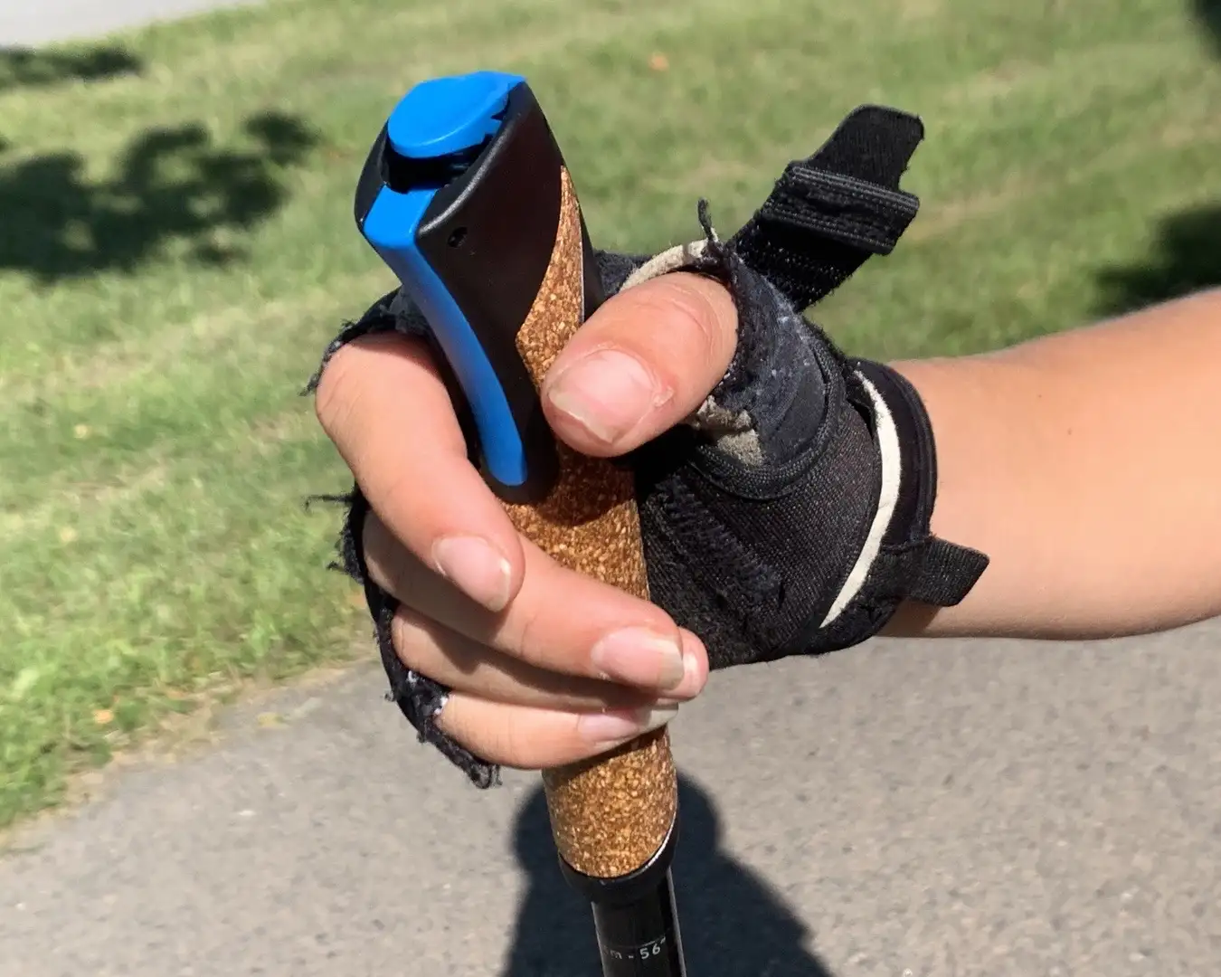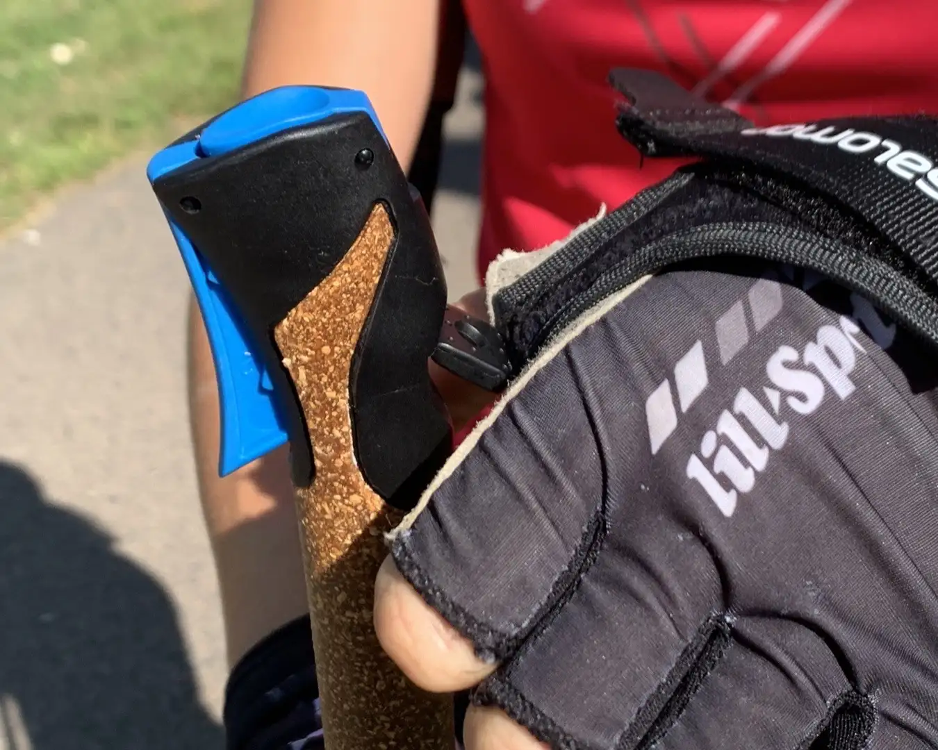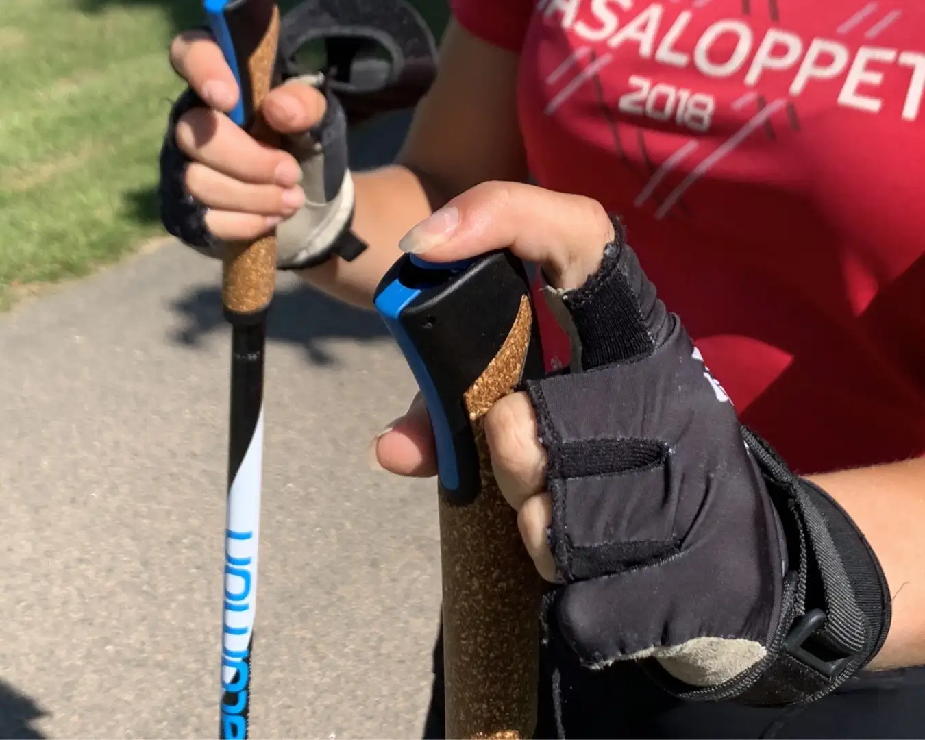 När du tar på stavarna trär du handen genom remmen underifrån och tummen genom det mindre hålet.
